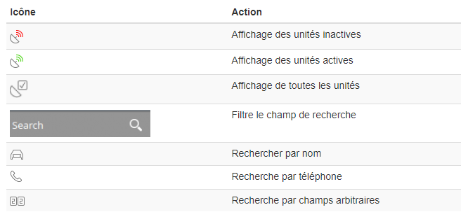 Pour rechercher rapidement des unités, un champ de texte est fourni. La recherche est effectuée au fur et à mesure que de nouveaux caractères sont saisis.