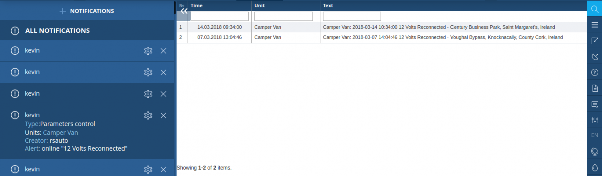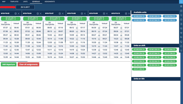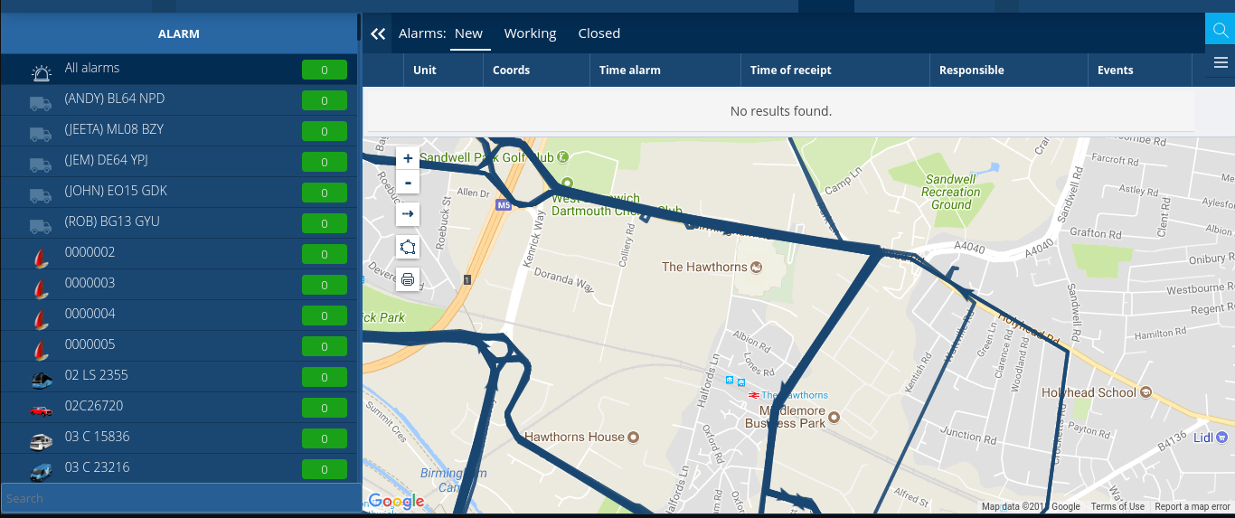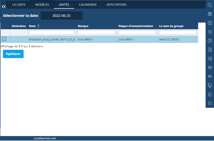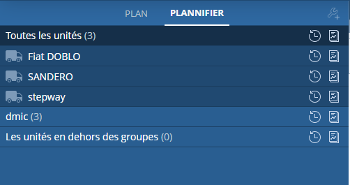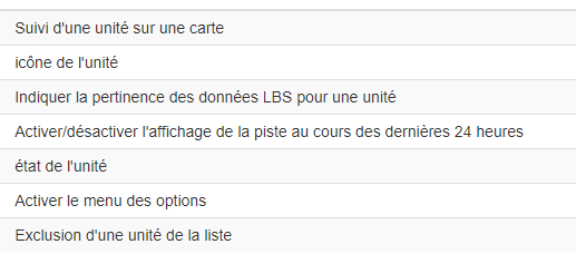 Lorsque vous cliquez sur le bouton Unités , une liste d'unités s'affiche. La liste contient des unités ajoutées indépendamment par l'utilisateur à partir de la liste générale des unités. La carte affichera toutes les unités de la liste générée. Les informations sur les unités sont mises à jour automatiquement toutes les 20 secondes.