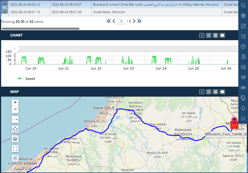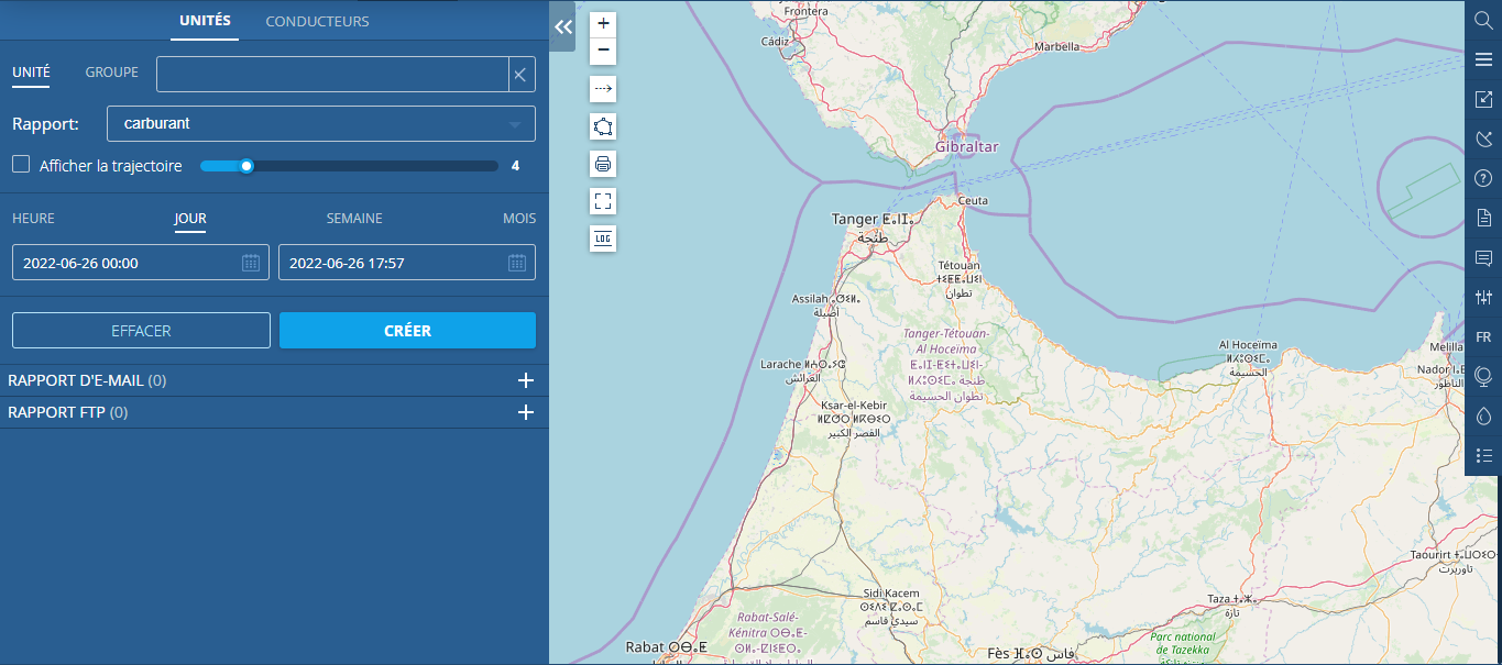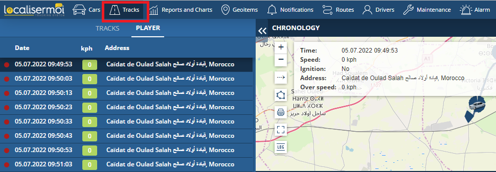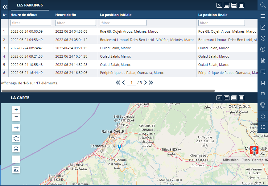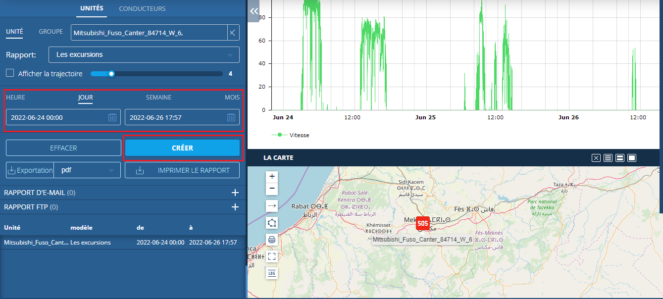 Lorsque vous cliquez sur une ligne avec des données, la carte se positionne sur l'emplacement de l'unité à partir de l'instant sélectionné.