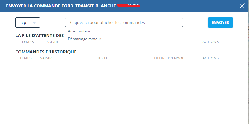L'option "coupe moteur" est disponible sur la plateforme, afin d'immobiliser un véhicule il suffit d'envoyer la commande via l'interface utilisateur en selectionnant le véhicule que vous souhaitez arrêter ou via l'envoi d'un SMS au numero attribué au dispositif GPS connecté à l'unité. La configuration des commandes se fait par le service technique à la demande de l'utilisateur, une fois que les commandes sont configurées, ils apparaiteront sur la liste des commandes.