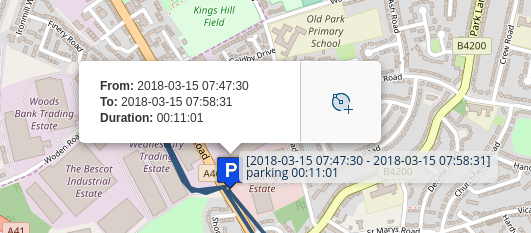 1. Parking/Stops – affiche les arrêts de l'unité pendant un certain temps. Un parking/arrêt est indiqué sur le plan de la manière suivante :