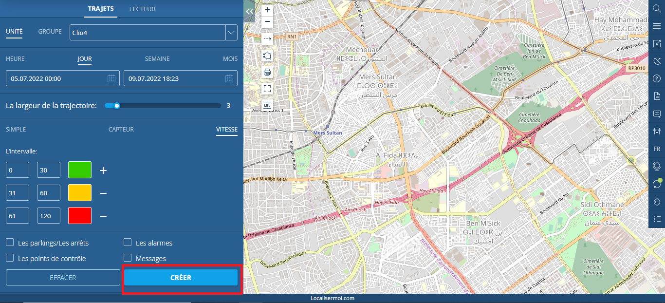 Pour reproduire le mouvement de l'unité (véhicule) le long du tracé sur la carte, cliquez sur le bouton
