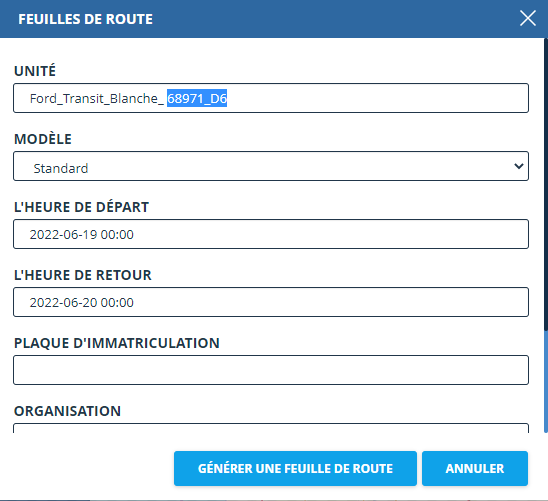 - Feuille de route – Création d'une feuille de route. Pour une description détaillée de la fonction, voir la sous-section Trip Sheets;