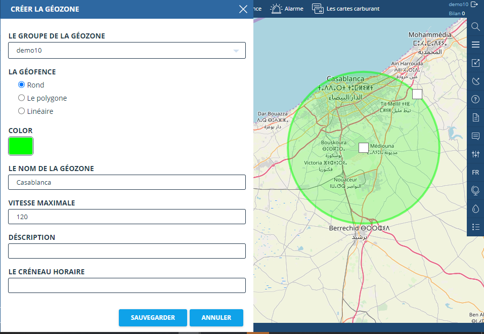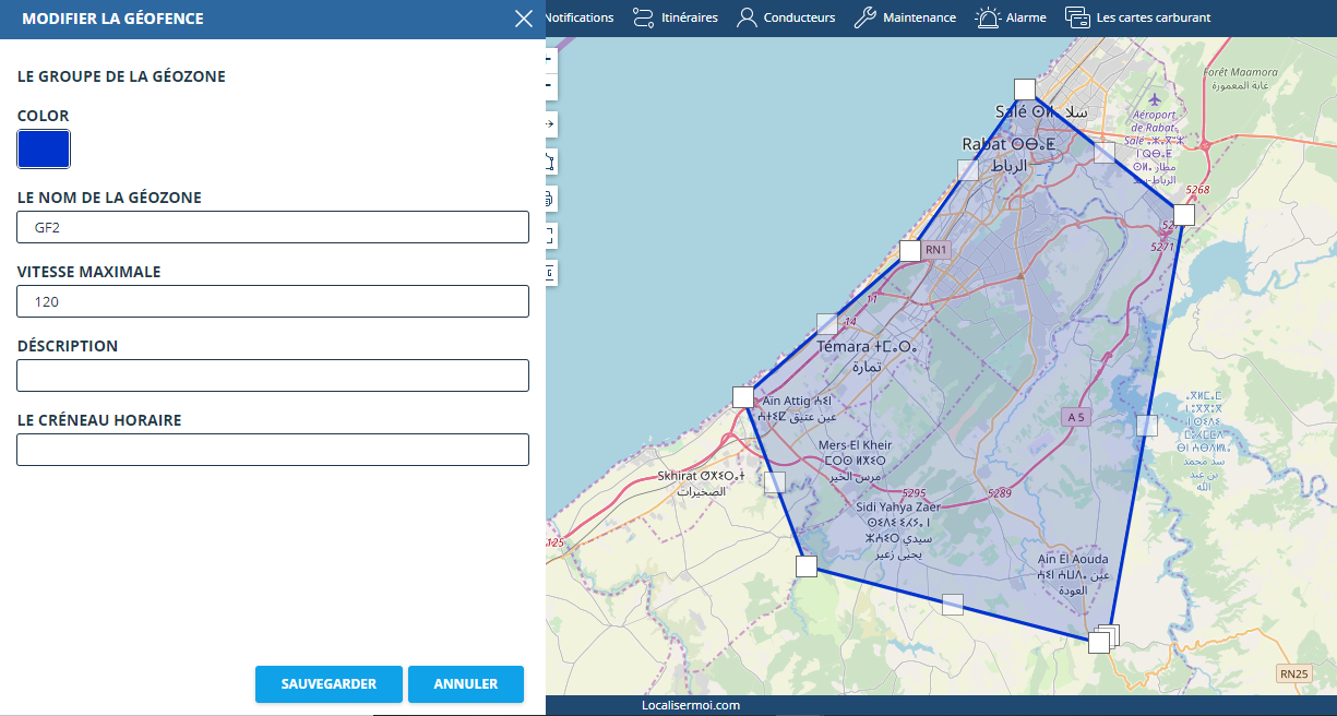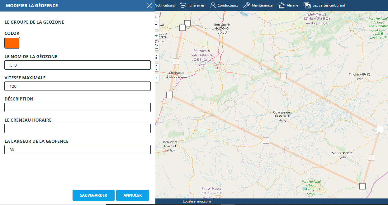 A l'aide des Geo-fences vous allez pouvoir définir des zones virtuelles précises afin de suivre efficacement les déplacements des véhicules et être notifié en temps-réel une fois que votre véhicule entre ou sort d'une zone détérminée.