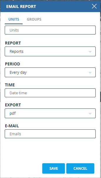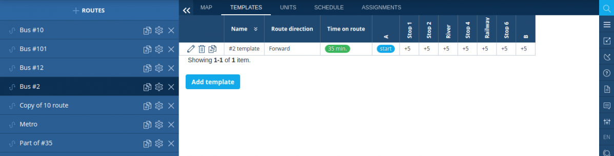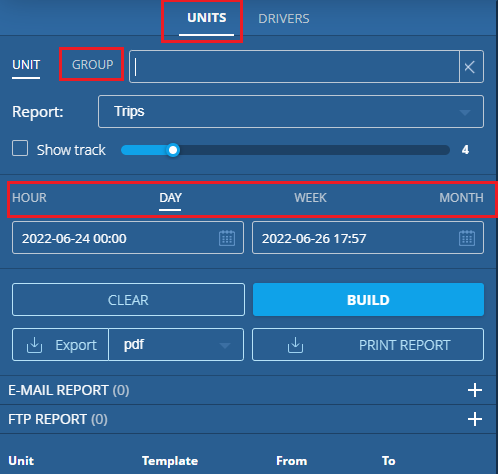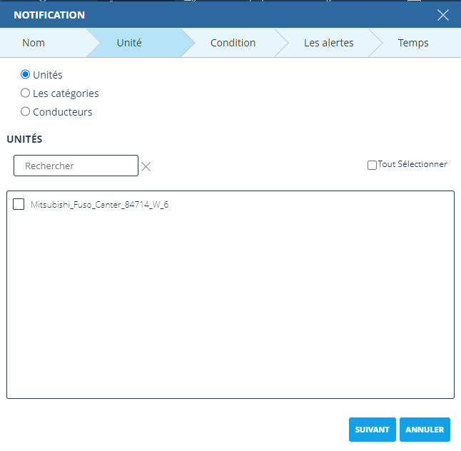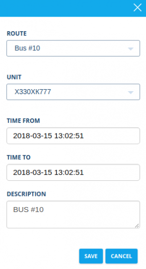 Une piste (itinéraire) est créée pour une seule unité (véhicule). Dans ce cas, toutes les pistes créées sont enregistrées et disponibles pour visualisation jusqu'à ce qu'elles soient fermées par l'utilisateur. L'unité pour laquelle vous souhaitez créer une piste doit être sélectionnée dans la liste déroulante.