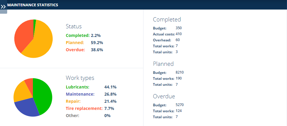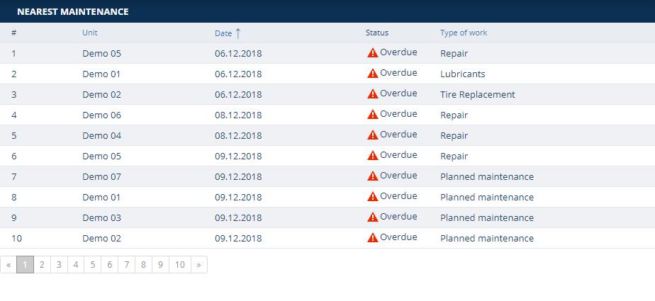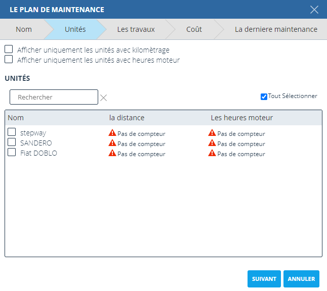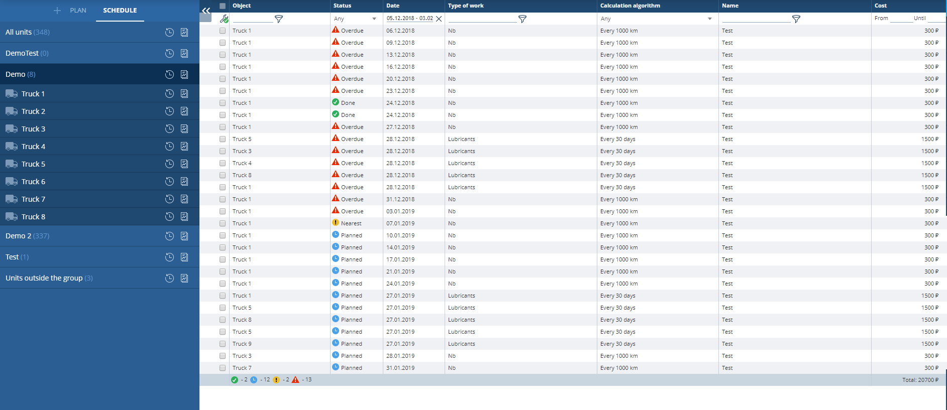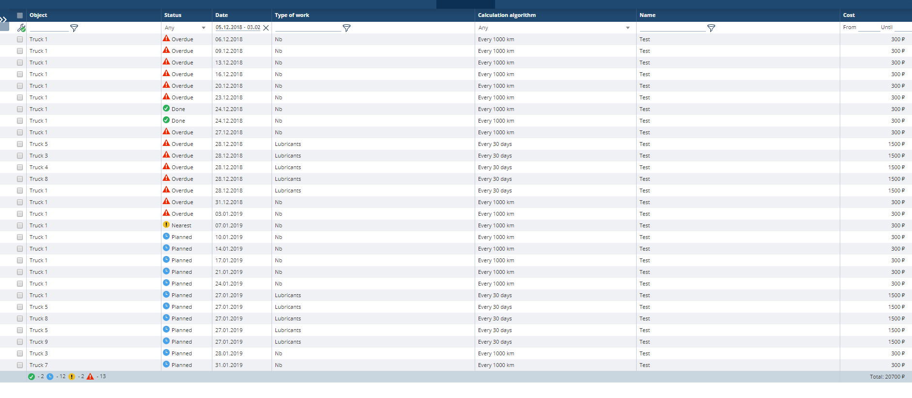 Cet onglet est une liste des travaux, contenant une liste d'unités (véhicules). En fonction de l'algorithme de calcul, il est nécessaire de spécifier des données sur les derniers travaux de maintenance pour chaque unité.