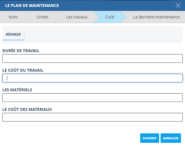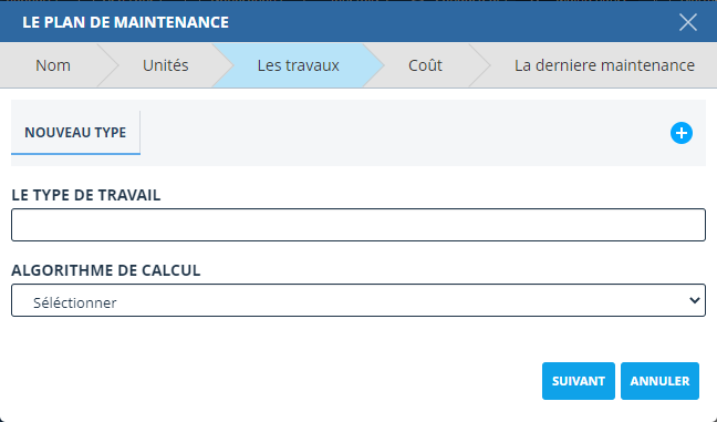 Cet onglet est une liste de travaux de maintenance précédemment citées, pour chaque travail d'entretien vous devez préciser :