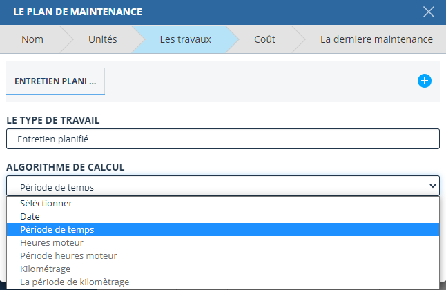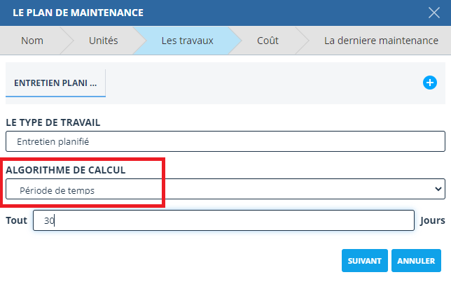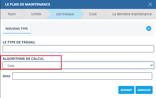 Il est nécessaire de préciser la date de la dernière maintenance ou la date d'achat si l'algorithme de calcul est « Période de temps ».