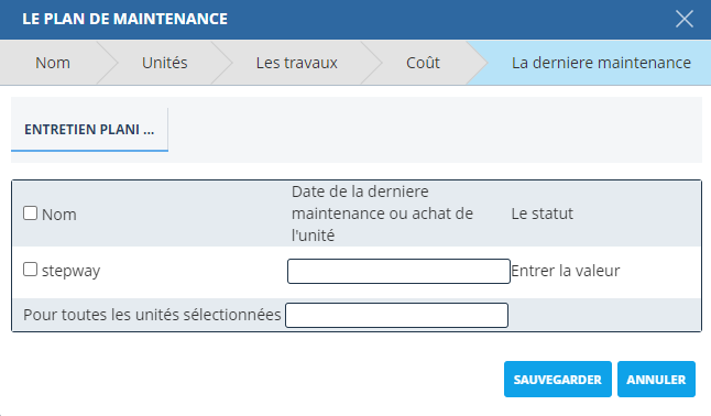 Il est possible d'ajouter des enregistrements sur l'historique de maintenance pour une unité ainsi que pour un groupe d'unités.